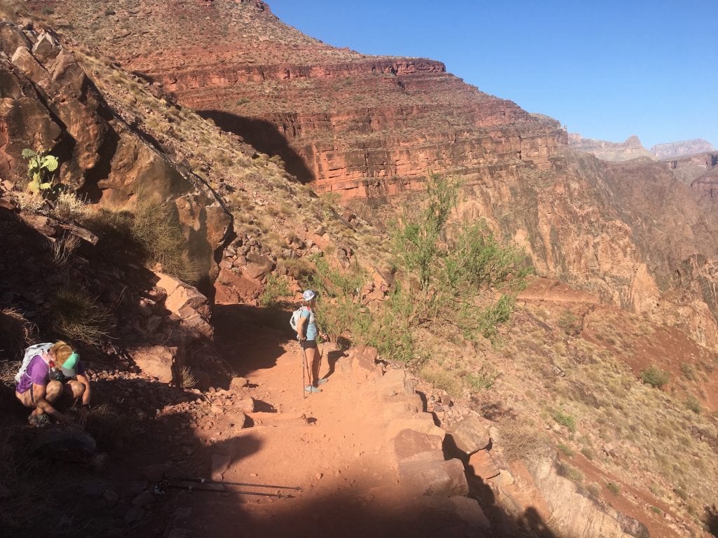 We quickly shed our top layers, and within 30 minutes, all of us were in tees and shorts (and lathered in sunscreen). The sun didn’t feel super intense, though. That said, we were super diligent about eating and drinking. We met a group of women coming off of rim-to-rim the previous evening, and one of the members in their group had a rough, rough day, barely making it out.