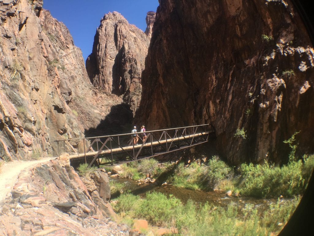 We hit the lowest elevation we’d see all day after about three hours of downhill (and plenty of stops). My knees were definitely ready to be done with the down, and we arrived at the bridge across the Colorado River just in time to see a mule train heading up. Dang it that we didn’t have an apple core to feed this guy, who tried to eat Jo’s gummi bears instead.